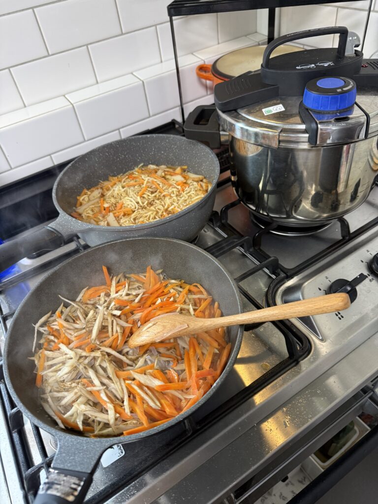 きんぴらごぼうと、切り干し大根の煮物。圧力鍋に中には鶏の手羽元が入っています。ポトフに。
